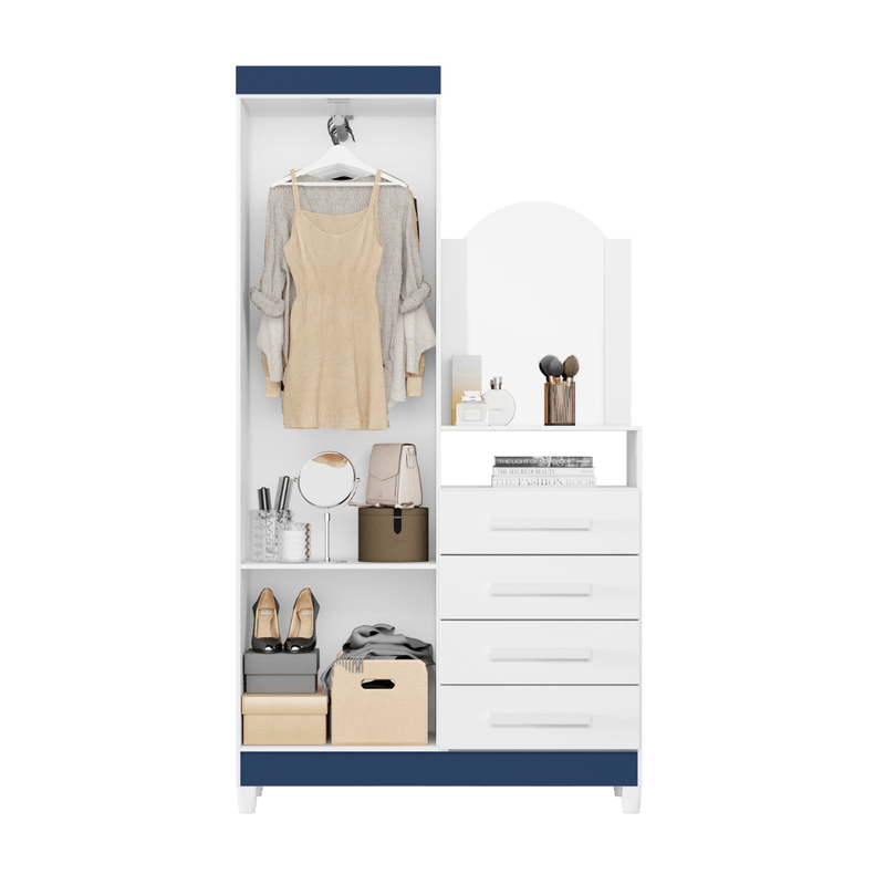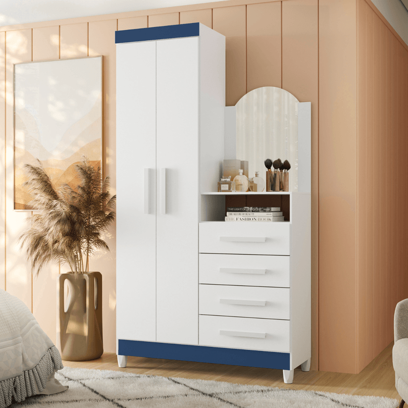 • Multifunción 3 en 1: Combina el almacenamiento vertical (2 puertas), la organización interna (4 cajones) y un Tocador Integrado con Espejo Curvo.