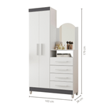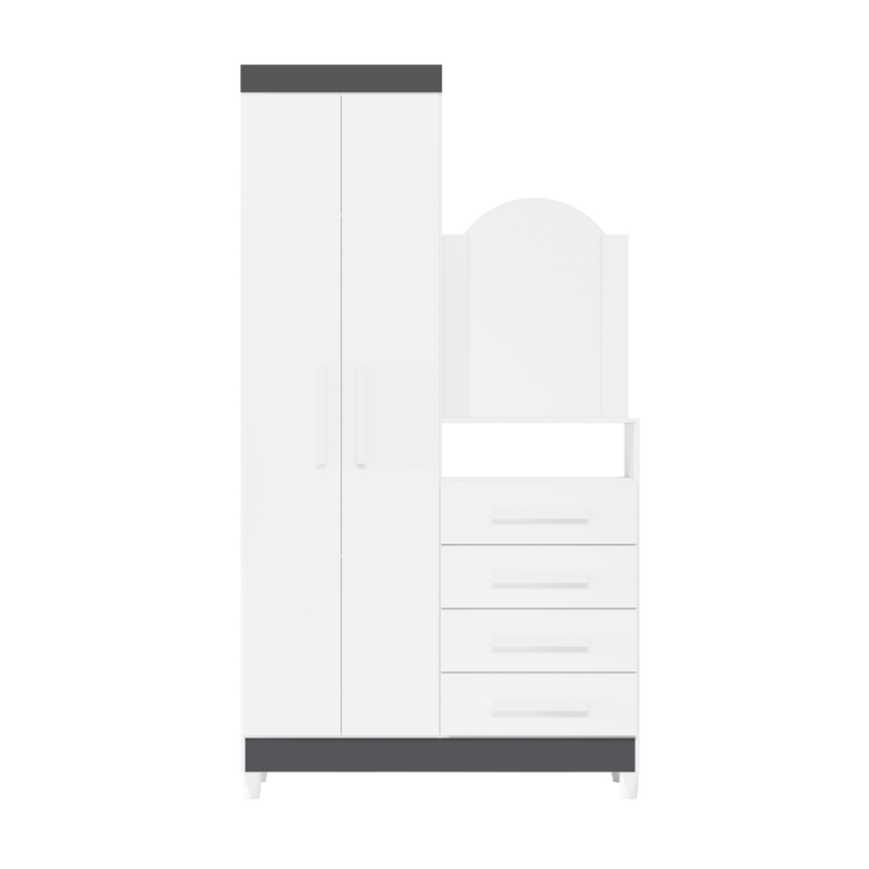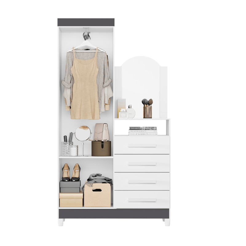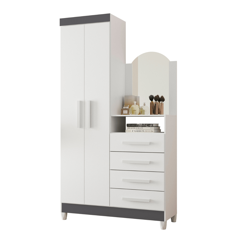 - Multifunción 3 en 1: Combina el almacenamiento vertical (2 puertas), la organización interna (4 cajones) y un Tocador Integrado con Espejo Curvo.