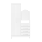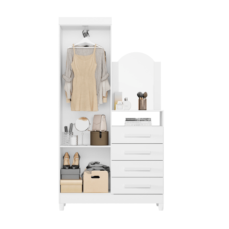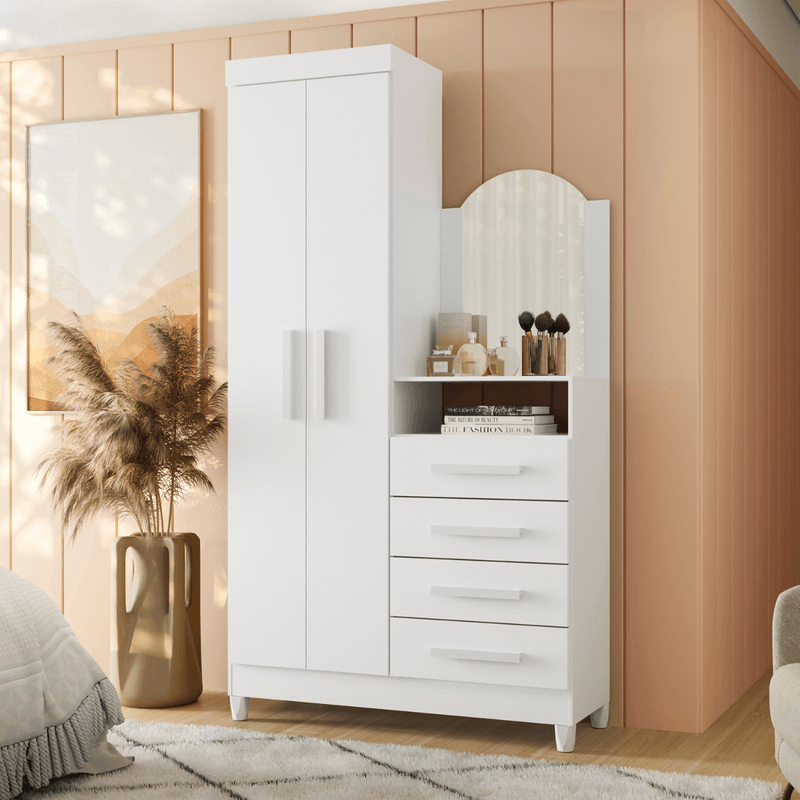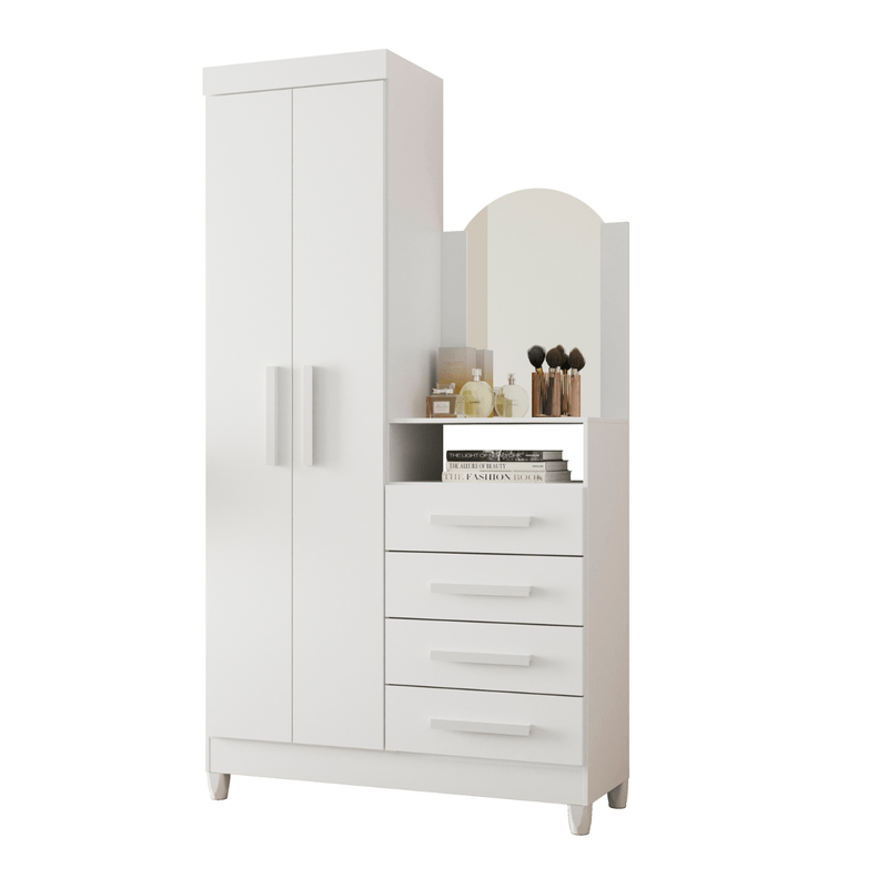 • Multifunción 3 en 1: Combina el almacenamiento vertical (2 puertas), la organización interna (4 cajones) y un Tocador Integrado con Espejo Curvo.