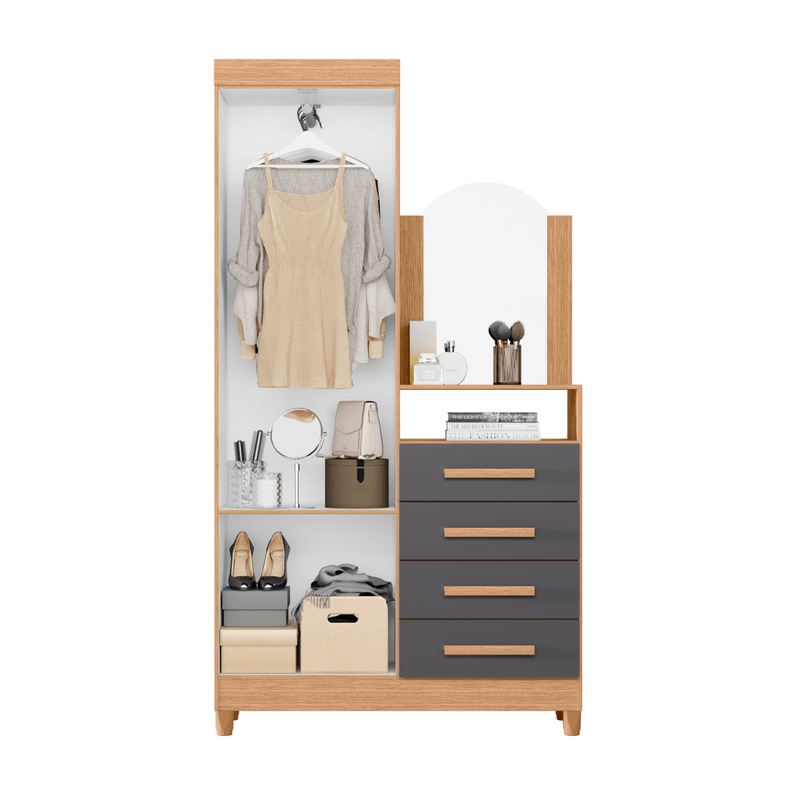 - Funcionalidad 3 en 1: Unidad de almacenamiento con 4 cajones, 2 puertas y un Tocador/Espejo integrado, maximizando la utilidad en espacios pequeños.
