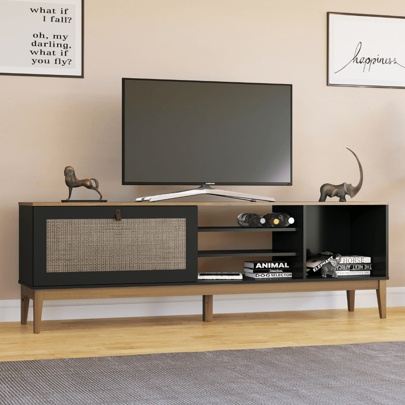 Mesa para TV Bertolini modelo: MB 1024. Medidas en cm: Alto 60 x Largo 184 x Ancho 40. Esta mesa tiene un diseño vintage que te encantará. Sus patas son de madera maciza lo que garantiza aún más la calidad y resistencia al producto. Tiene una puerta basculante enmarcada con una exclusiva pintura de paja 3D. Tiene un tirador de asa de cuero. Ideal para soportar con seguridad una pantalla de hasta 60 pulgadas. Este mueble es un producto completo, contempla belleza, practicidad, calidad y seguridad. Disfruta de su diseño, practicidad y, sobre todo, combínalo con los demás muebles que Bertolini tiene para ti.