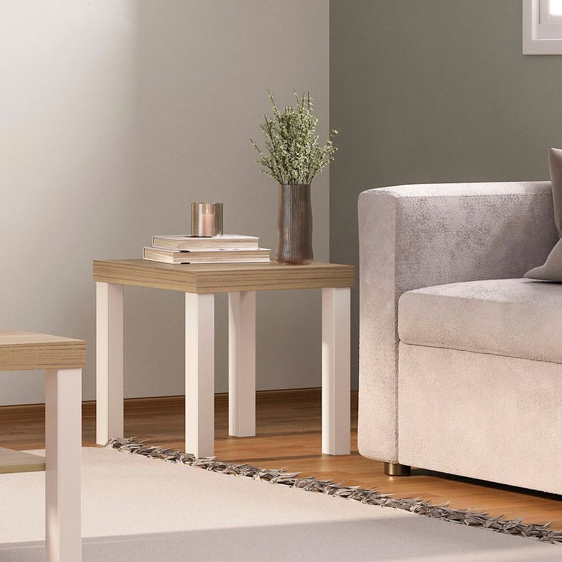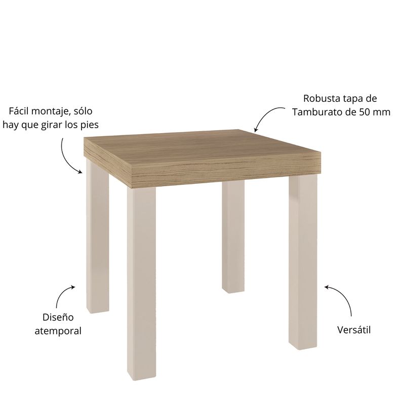 Con tapa en tamburato de 50 mm que aporta presencia y resistencia sin añadir peso excesivo, y patas de fácil montaje (giro simple para ensamblar), garantiza durabilidad y estabilidad en el uso diario. Su forma cuadrada y líneas limpias permiten colocar lámparas, libros, bebidas o elementos decorativos, optimizando el espacio y aportando un punto focal discreto pero sofisticado en la estancia.
