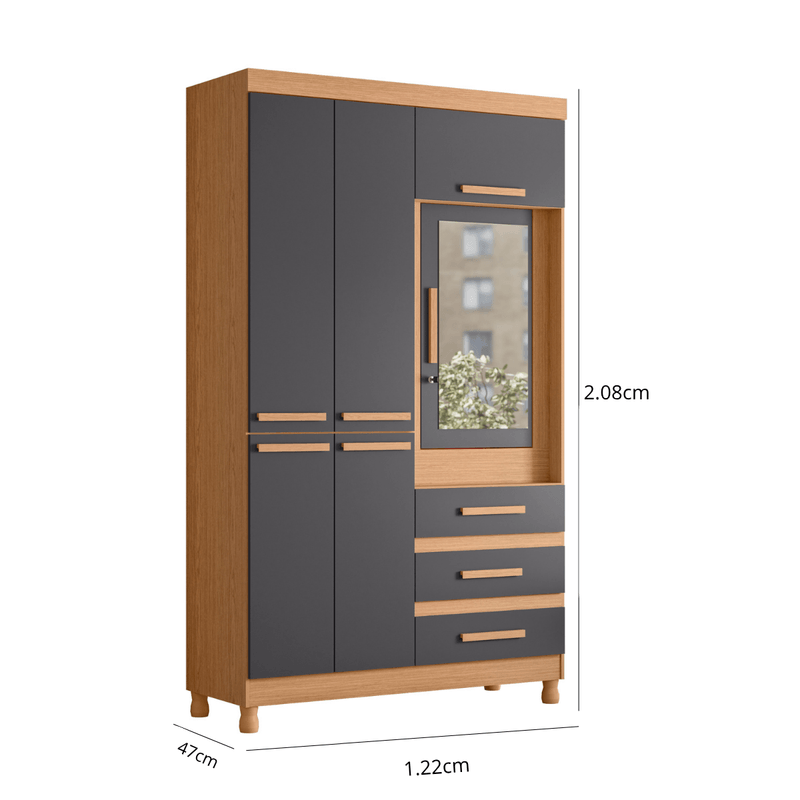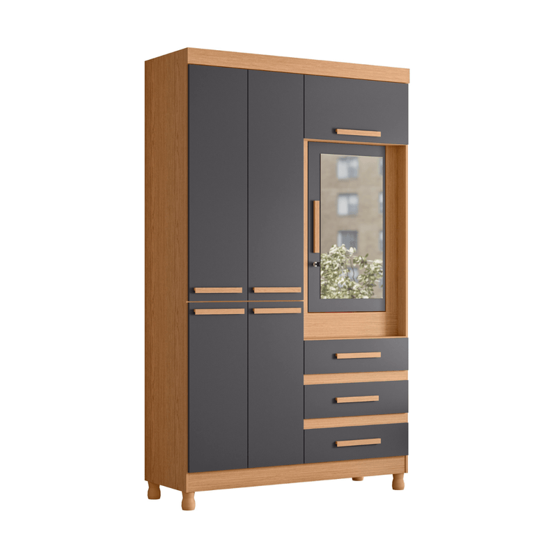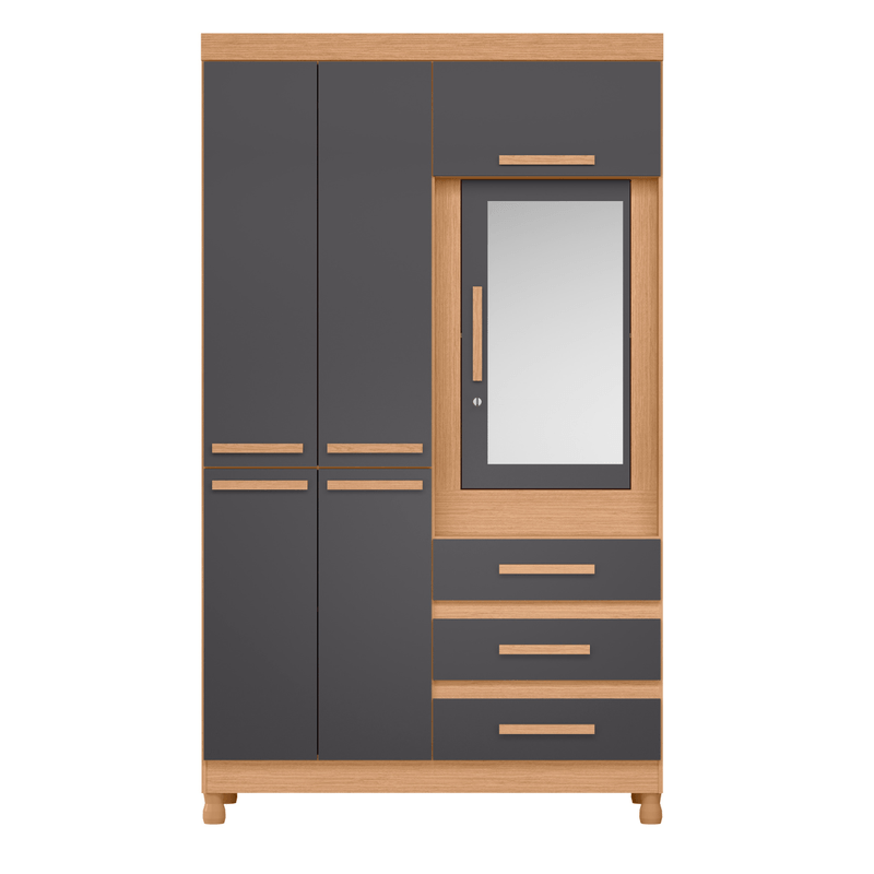 El ropero Bertolini Fusion está diseñado para quienes quieren una recámara moderna, organizada y con un toque sofisticado. Su combinación de color y acabado UV con relieve mate le da presencia propia en la habitación. Cuenta con 4 puertas abatibles y una puerta lateral con espejo grande y llave para mayor seguridad. Incorpora 3 cajones amplios con correderas metálicas, además de un interior muy bien aprovechado con repisas, estructura central tipo panal, armario inferior, barras para colgar hecha de aluminio. La estructura en MDP y el acabado UV garantizan un mueble resistente, elegante y duradero.