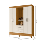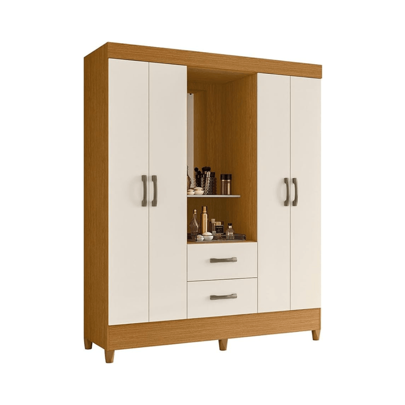 El ropero Bertolini Movyli Capelinha es un armario moderno y funcional, ideal para quienes buscan ordenar su recámara sin perder estilo. Su combinación en color cinamomo y off white aporta calidez de madera y un toque sofisticado que ilumina el espacio. Con 4 puertas, 2 cajones, 3 estantes internos, percheros y un espejo central tipo “capelinha”, te permite organizar ropa, calzado y accesorios en un solo mueble. Fabricado en MDP con acabado en pintura UV semibrillante, está diseñado para el uso diario y para aprovechar al máximo el espacio de tu dormitorio.